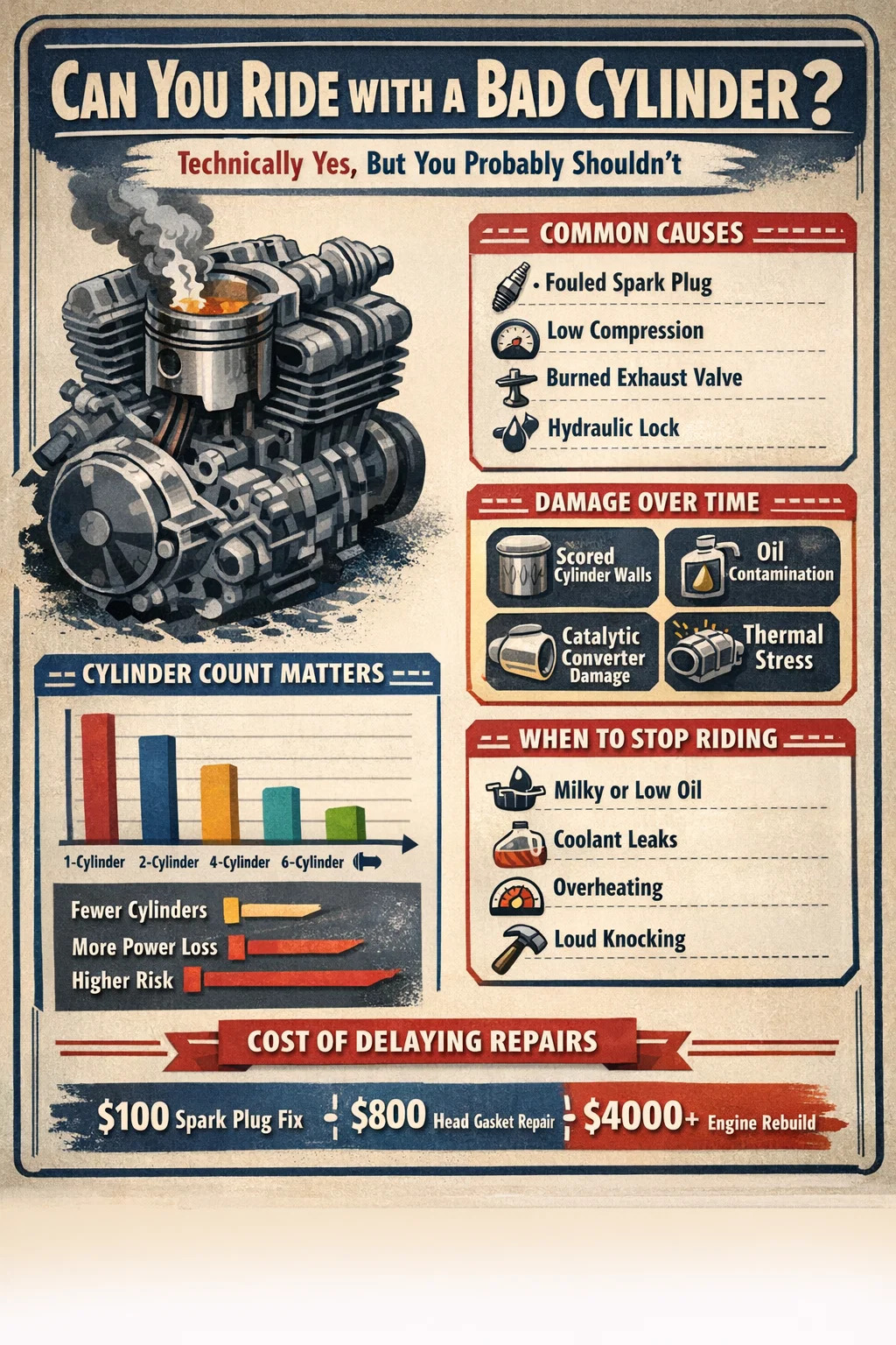 Cuando un cilindro de motocicleta funciona en frío (sin disparar) mientras los cilindros adyacentes funcionan en caliente, la expansión térmica diferencial a través de la culata crea tensión mecánica. Con el tiempo, esto puede provocar que la junta de culata falle en el límite entre un cilindro muerto y uno encendido. El reemplazo de la junta de culata en una motocicleta generalmente requiere el desmontaje completo del motor y cuesta entre $400 y $1200 solo en mano de obra, antes de las piezas.