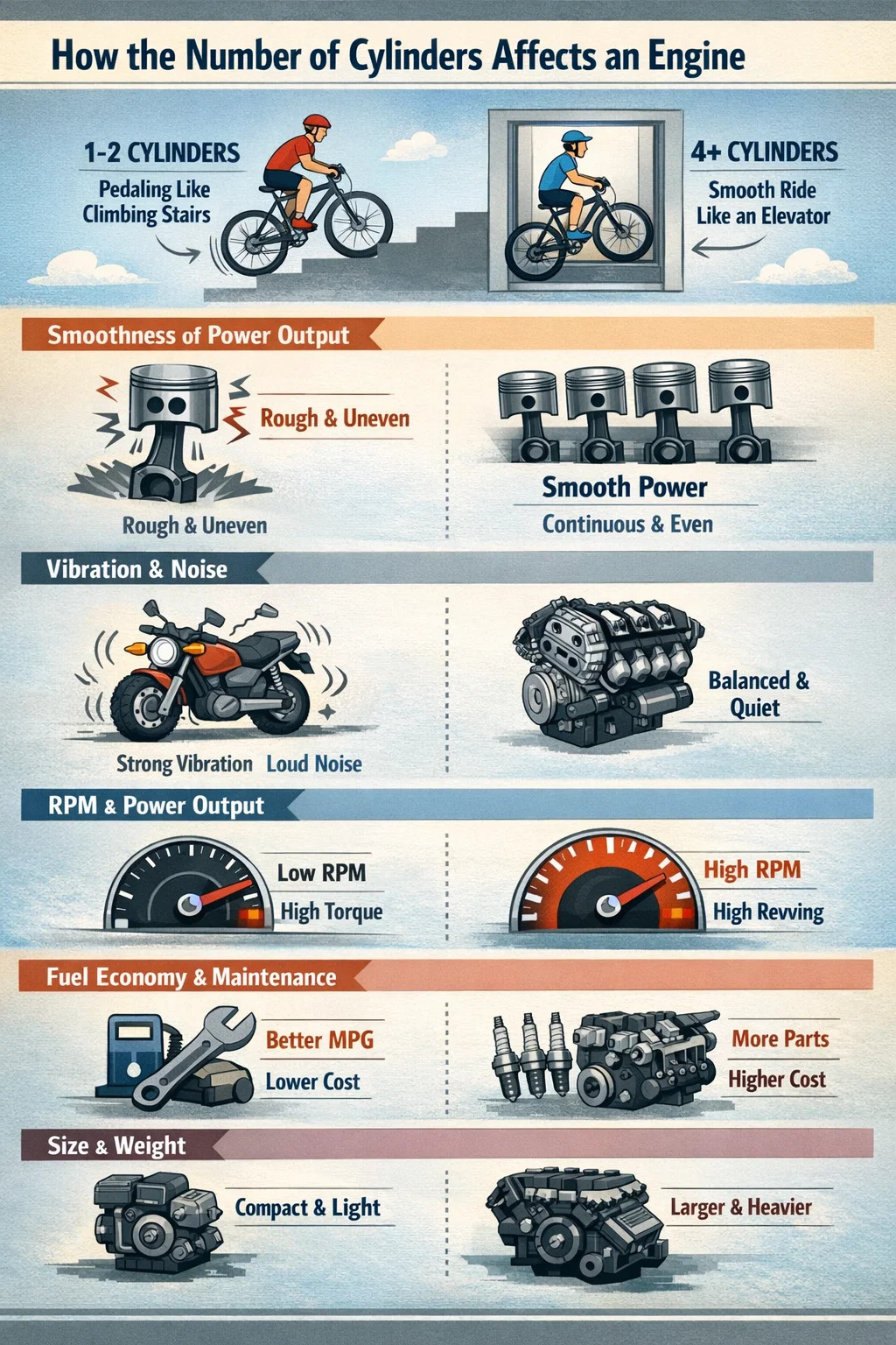 Número bajo de cilindros (1-2 cilindros): es como subir escaleras; Puedes sentir una "sensación de pedaleo" distinta. Este tipo de motor tiene buena potencia a bajas RPM, pero la potencia de salida tiene una sensación pulsante notable y no es muy continua.