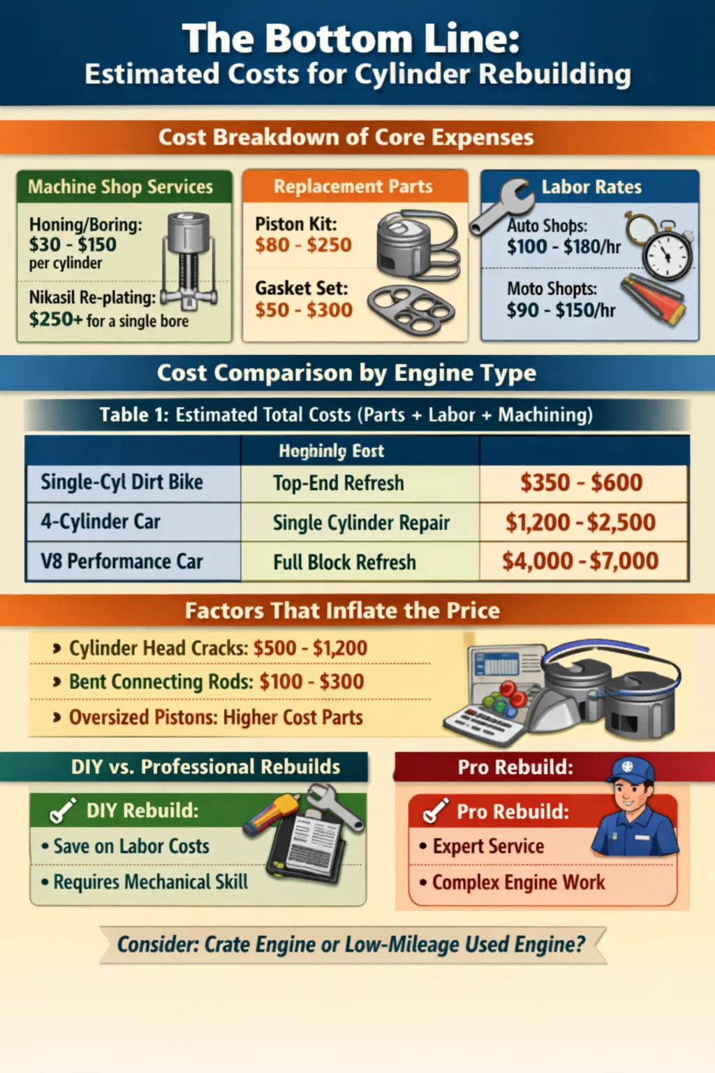 El costo de reconstruir un cilindro generalmente oscila entre $500 a $1,500 por cilindro para motores de automóviles, mientras que un solo cilindro de motocicleta a menudo se puede actualizar durante entre $300 y $800 . Estas cifras varían enormemente dependiendo de si está realizando una actualización "de gama alta" (anillos y juntas) o una restauración mecánica completa que implica taladrar, bruñir y pistones de gran tamaño. Si realiza el desmontaje usted mismo, puede ahorrar significativamente en mano de obra, que normalmente representa 60% a 70% de la factura total.