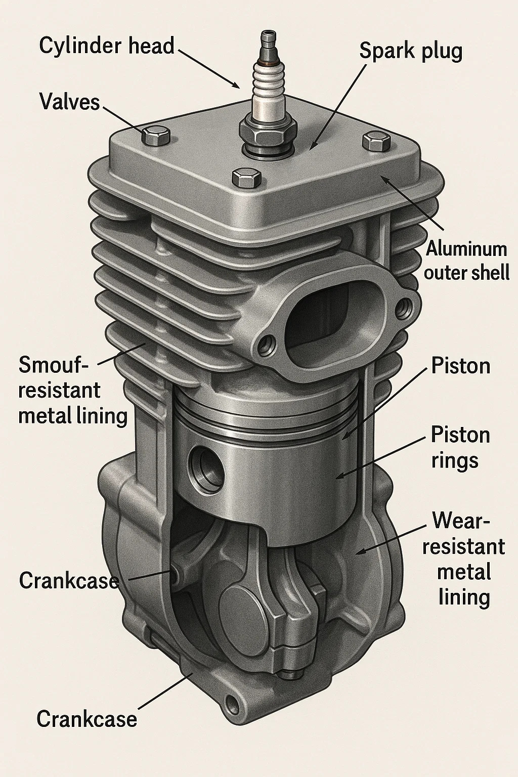 El cilindro tiene aletas de enfriamiento (enfriadas por aire, como escamas de pescado) o una camisa de agua (enfriada por agua, que contiene refrigerante) para evitar que las altas temperaturas derritan las piezas.